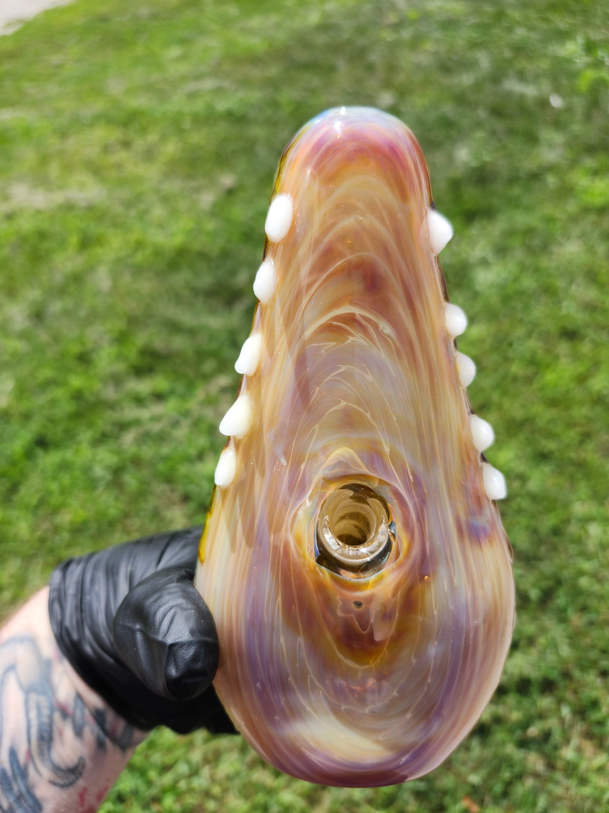 This hand spun gator by artist Addison Hanna is the true definition of "functional glass art." Pieces of glass that appear to be pieces of art, but infact are also a pipe. This gator features the color dragons tears, which has amazing striking abilities, creating a variety of hues.