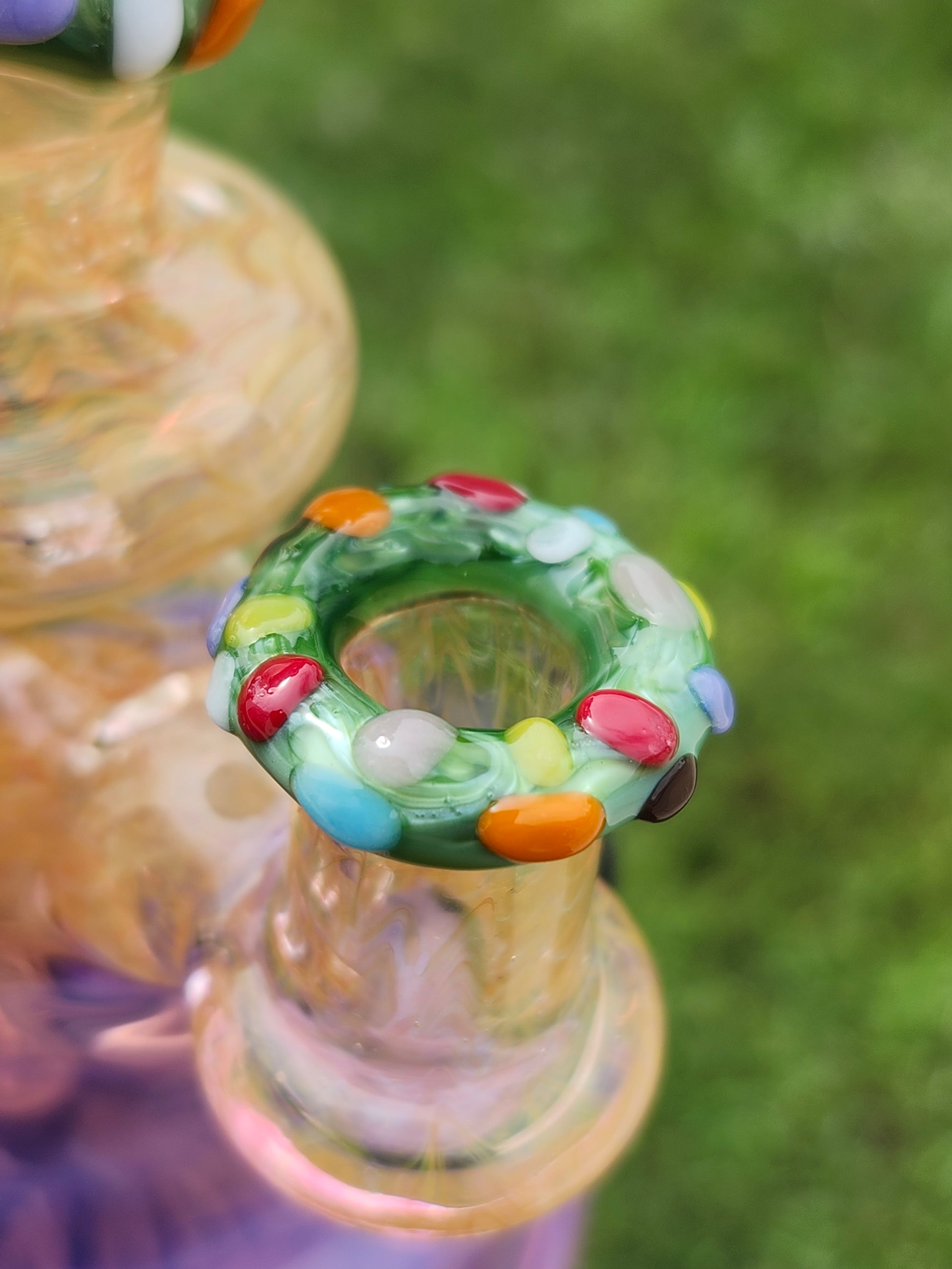 A blend of silver and gold fume to create a wild fume pattern. Along with a cluster of Chromium donuts with sprinkles & a drizzle of ion - that glows in the dark!